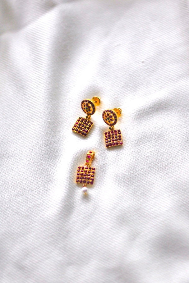 Our temple jewelry is crafted in 92.5 sterling silver and set in crystal kemp (red) stones.